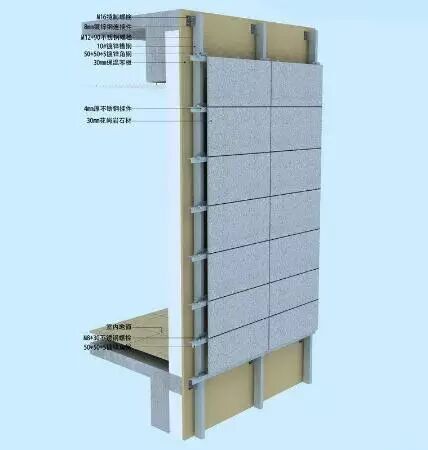 石材及干掛體系的力學計算 應該先確定幕墻所受的荷載及作用形式,再確定石材的干掛方式,進而確定石材板塊的計算模型,并進行受力安全性計算,最后根據干掛體系所受荷載值,確定干掛體系的構造形式和所用掛件、連接件、埋件及橫豎龍骨的規格尺寸。石材及其干掛體系的設計應符合國家行業標準《金屬與石材幕墻工程技術規范》(JGJ133—2001)的要求。